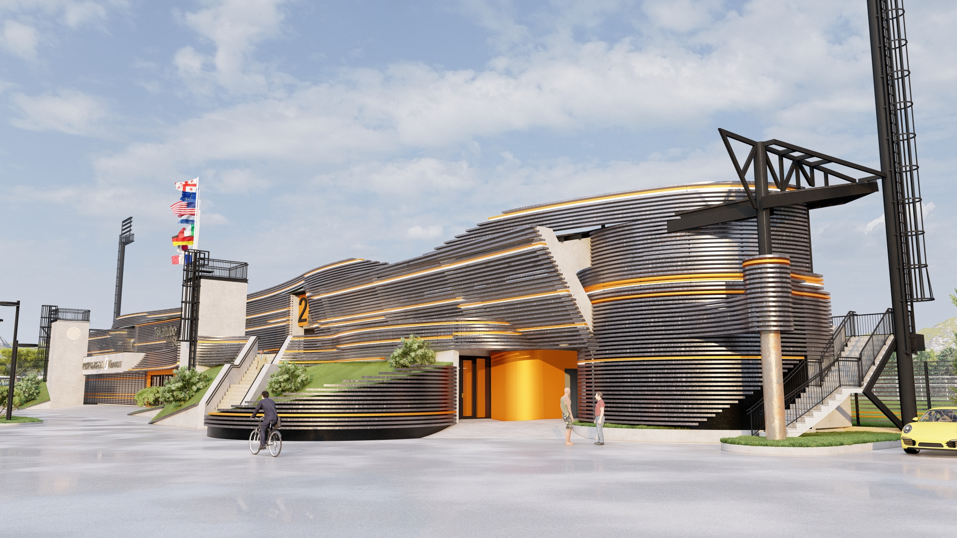 The façade is made from a combination of polished concrete, metal, and aluminum profiles. The horizontal lines of the cladding create a visual sense of movement and energy, while the contrast of colors gives it a bold, contemporary look. The durability of the materials ensures the facility’s long-term operation while minimizing the need for maintenance. At night, lighting highlights the rhythmic forms of the façade, giving the building a distinctive charm.